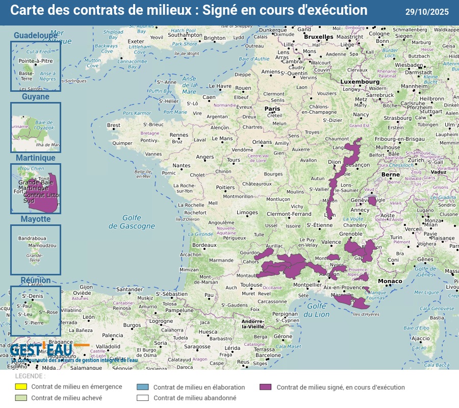Carte et liste des 22 contrats de milieux : Signé en cours d'exécution