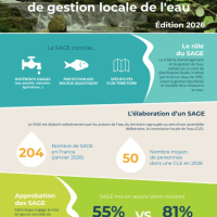 Les chiffres-clés sont valorisés dans l'infographie "Le SAGE, un outil de gestion locale de l’eau" réalisée par l'OiEau, avec le soutien financier de l'OFB et l’appui du Ministère de la Transition écologique. Elle explique ce que sont les SAGE, décrit leurs différentes étapes et présente l’évolution de ces démarches à travers des chiffres, des graphiques et une carte de situation. Mise à jour chaque année depuis 2017, elle existe aussi en anglais et en espagnol.
