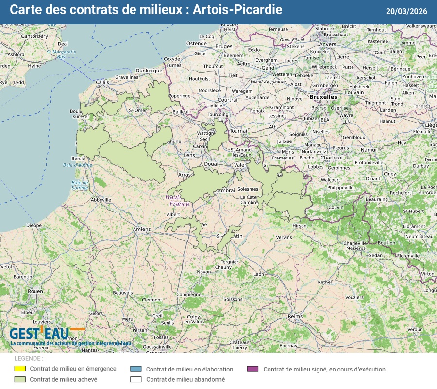 Carte et liste des 14 contrats de milieux du bassin Artois-Picardie
