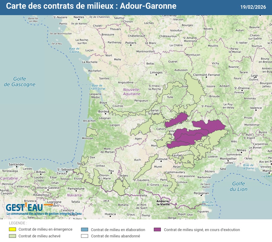 Carte et liste des 43 contrats de milieux du bassin Adour-Garonne