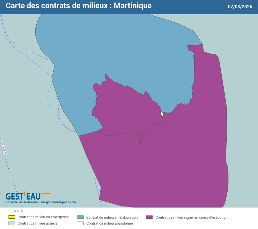 Carte et liste des 5 contrats de milieux du bassin Martinique