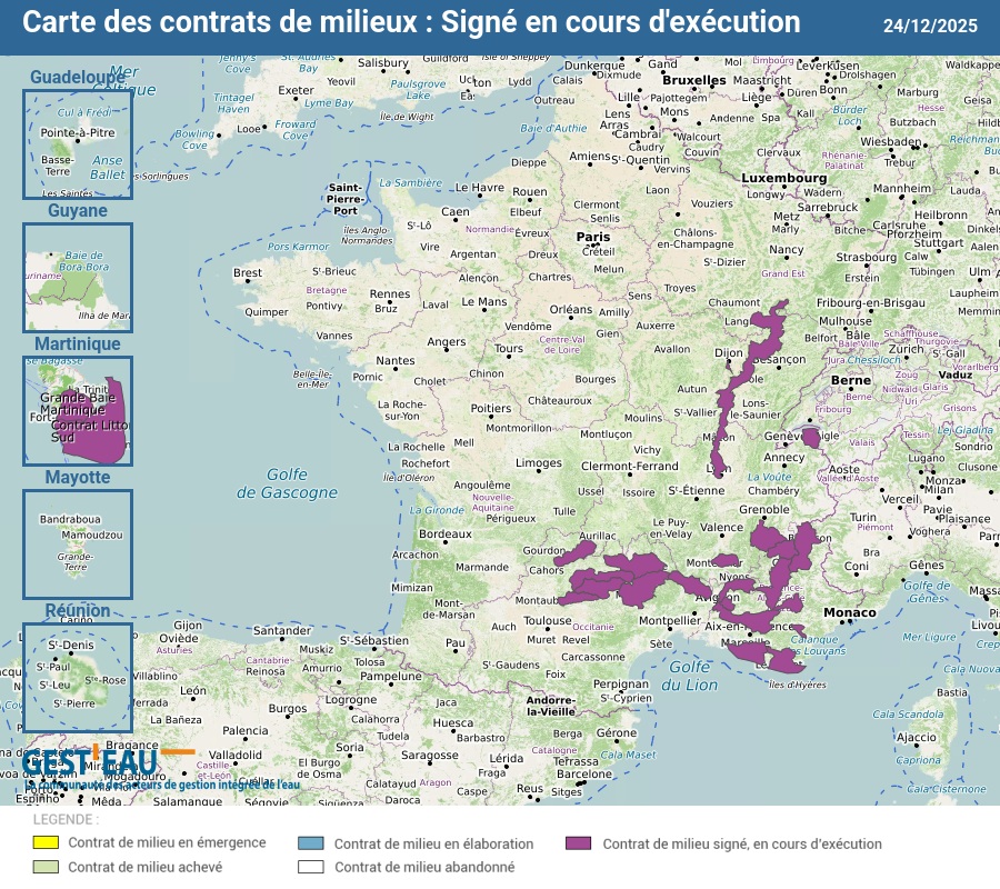 Carte et liste des 23 contrats de milieux : Signé en cours d'exécution