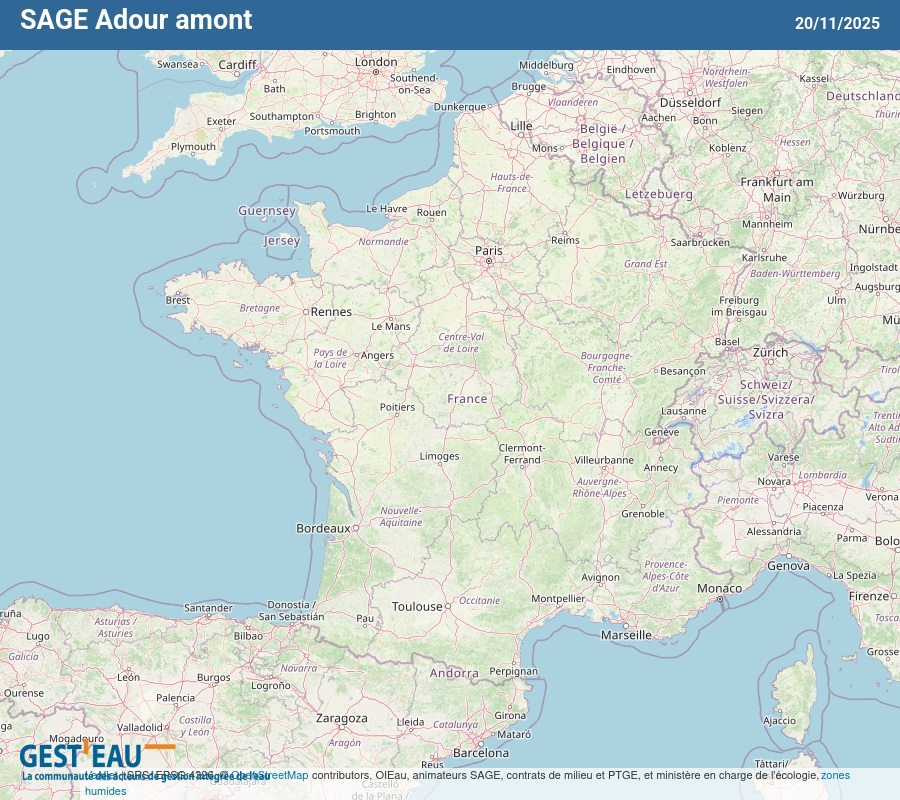 Le territoire du SAGE Adour englobe le bassin de l’Adour des sources au confluent des Luys réunis, à l’exclusion des sous-bassins de la Midouze : cours d'eau, zones humides et nappes superficielles du bassin versant de l'Adour jusqu'à la confluence avec les Luys.