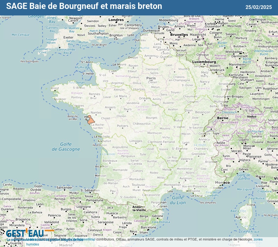 Le périmètre du SAGE est composé de 36 communes (22 en Vendée et 14 en Loire-Atlantique), incluses totalement ou partiellement dans le bassin versant de la baie de Bourgneuf. Il s’étend sur une surface d’environ 975 km², dont 350 km² de marais.
