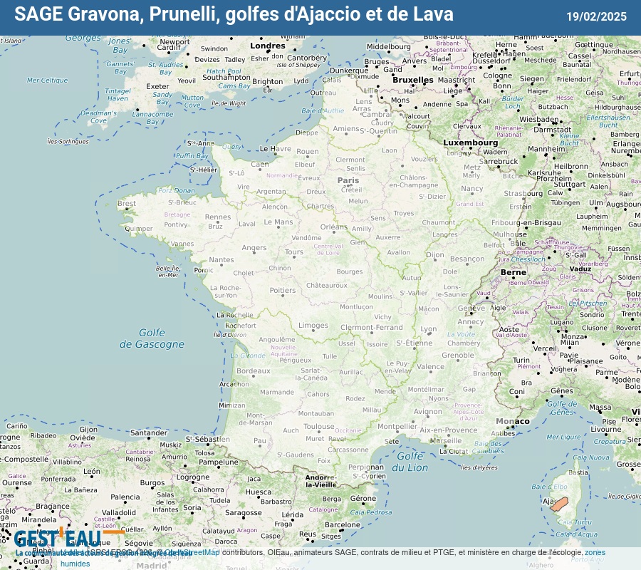 La limite Sud du périmètre du SAGE comprend la chaîne de montagne entre la Gravona et le Prunelli puis celle d’orientation Nord Est – Sud Ouest en rive gauche du Prunelli. La limite Est, comprend l’extrémité de la vallée de la Gravona, les gorges du Prunelli et plus au sud la ligne de crête d’une chaîne bordant la mer jusqu’à la baie de Cupabia. Une chaîne de montagne d’orientation Nord Est – Sud Ouest, puis des hauteurs d’orientation Sud – Nord constituent les limites Nord et Nord-Ouest du SAGE. La superficie du golfe d’Ajaccio est de 320 km². Il s’étend de la pointe de la Parata à Capo di Muro et définit la limite Ouest du territoire du SDAGE. Le golfe de Lava est compris entre la Pointe Pellusela sur Appietto et Capo di Feno sur Villanova.