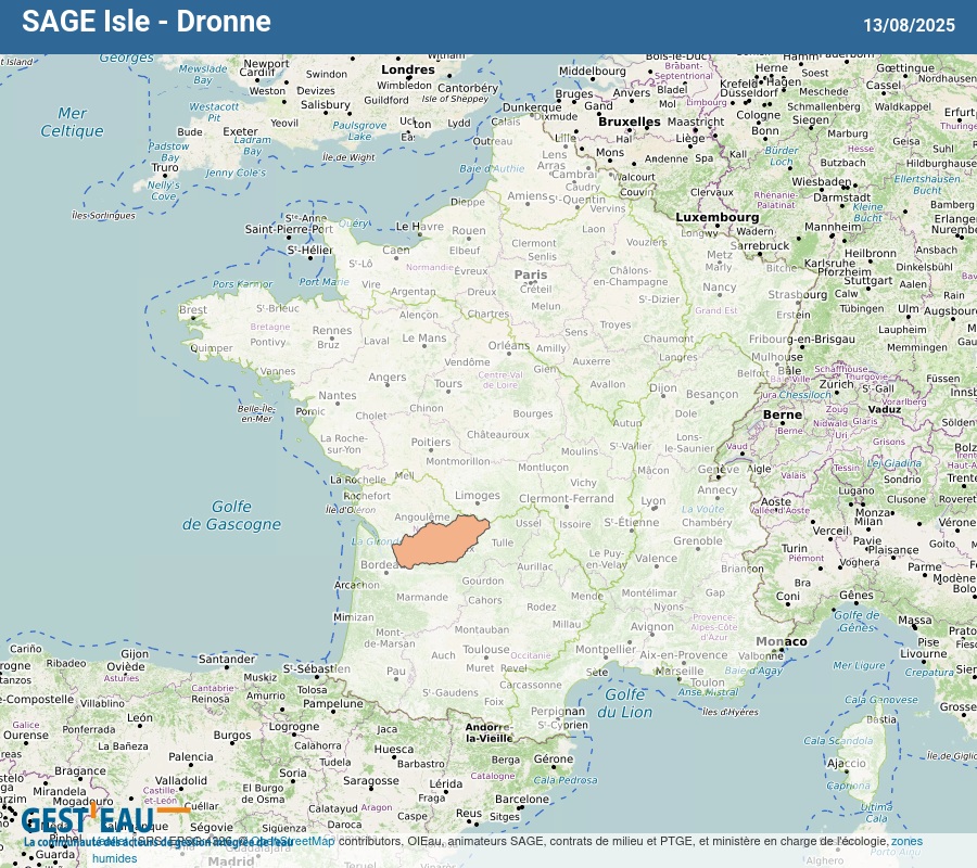 Le bassin Isle-Dronne s'étend sur 7 500 km², six Départements (Haute-Vienne, Corrèze, Dordogne, Charente, Charente-Maritime, Gironde) et la région Nouvelle-Aquitaine. Il concerne 497 communes et abrite environ 350 000 habitants. 5 840 km de rivières, dont l'Isle et la Dronne, parcourent le territoire.